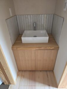 便所横の手洗いも 天板に栓の一枚板を使って