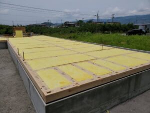 床の下に 断熱材を敷き詰めて床合板を施工して