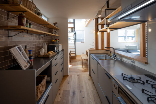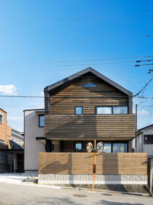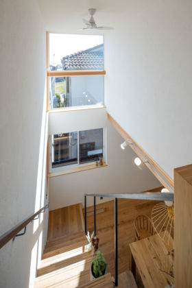 北側斜線・道路斜線・建ぺい率50%、更に前面道路の傾斜という厳しい制約と敷地面積124.47㎡(37.6坪)と限られた敷地の中で、窓から見える景色や採光と通風などの屋外環境の取り入れ方を工夫し、日々の暮らしの中で自然の恵みを感じて頂く事を大切にしながら、アウトドアグッズの収納場所を十分に確保する等、休日に自然の中で楽しく過ごす為のサポート機能も充実させました。