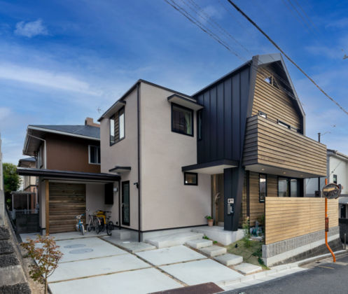 T字路のドン付に建ち、シンボリックな三角屋根が特徴で、玄関扉の引手に鹿の角を使用したりオリジナルの目隠しパネルを製作したり、音楽室やロフトが有ったりと遊び心も満載の住まいです。