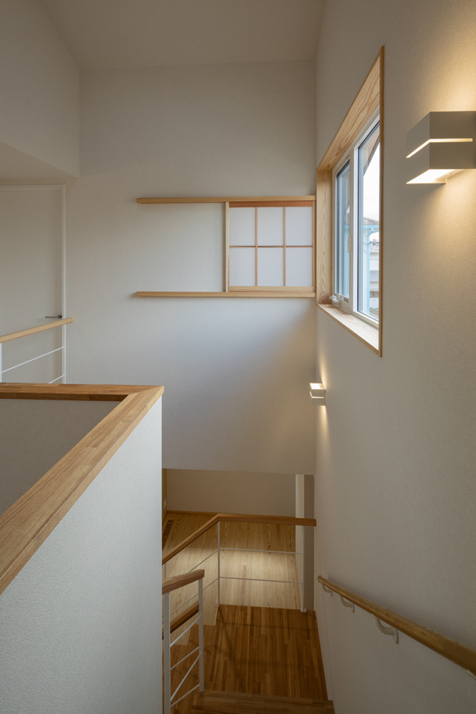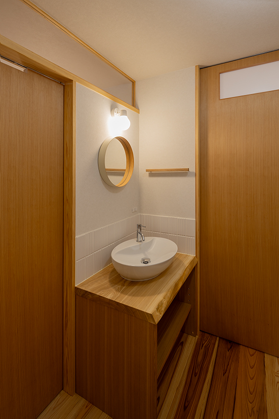 手洗いは造作で作り天板は栓の一枚板で仕上げています。 2階の吹き抜けから太陽光が入るようにして、どの部屋も明るくなるように計画させていただきました。 紀州材の自然乾燥材の良さが出ている住宅が完成したと思っています。