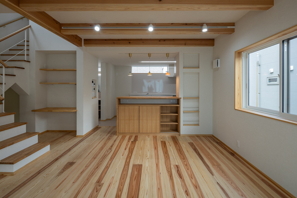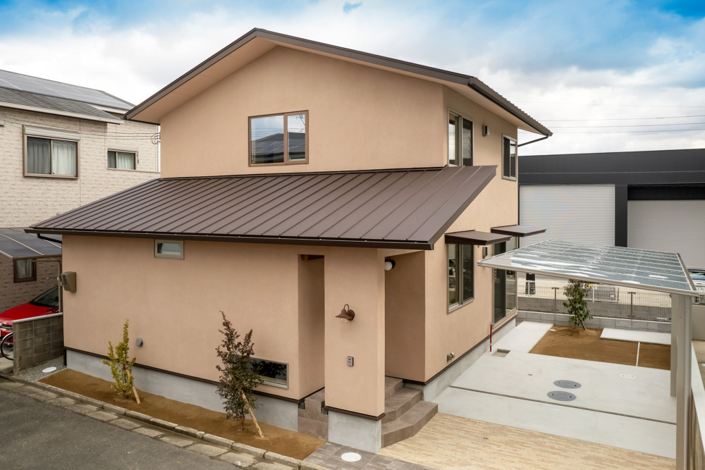 神前の家 2階建 延べ面積31坪の住宅になります。 暖かい家に住みたいご要望だったので、屋根に自然室温で暮らせるアイテムの「陽のまど」のパネルを4枚設置しています。 軒を出し外壁はモルタルかき落とし仕上げになります。