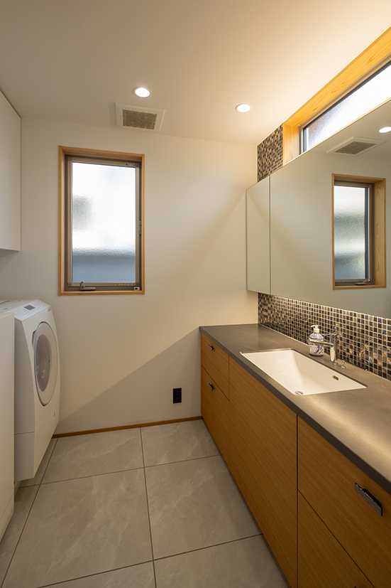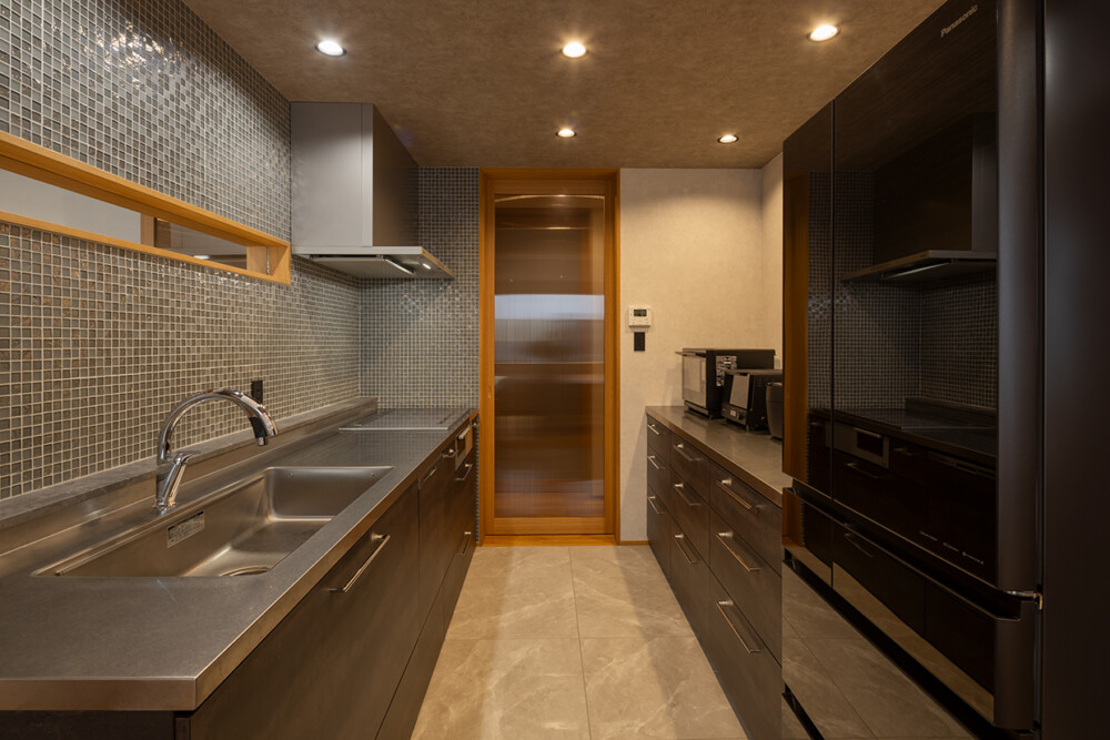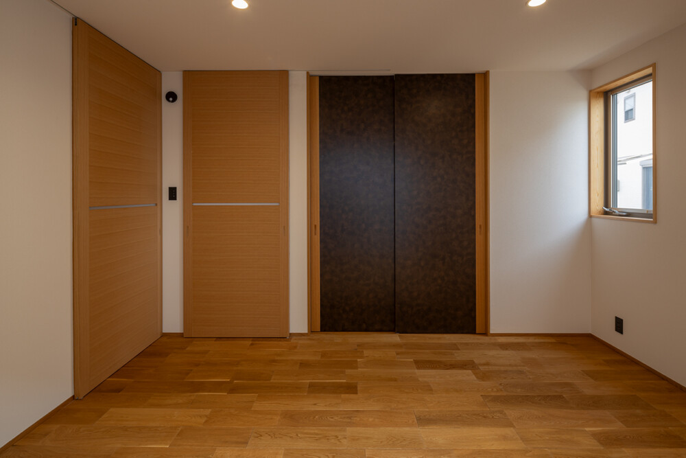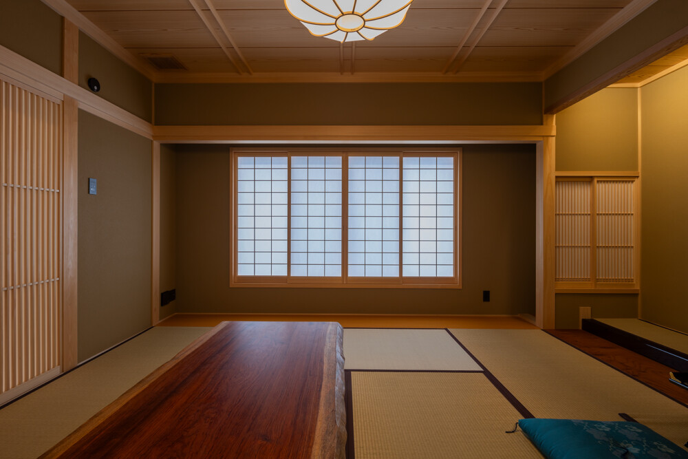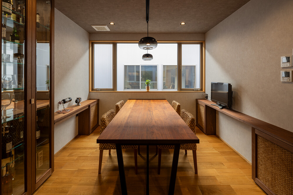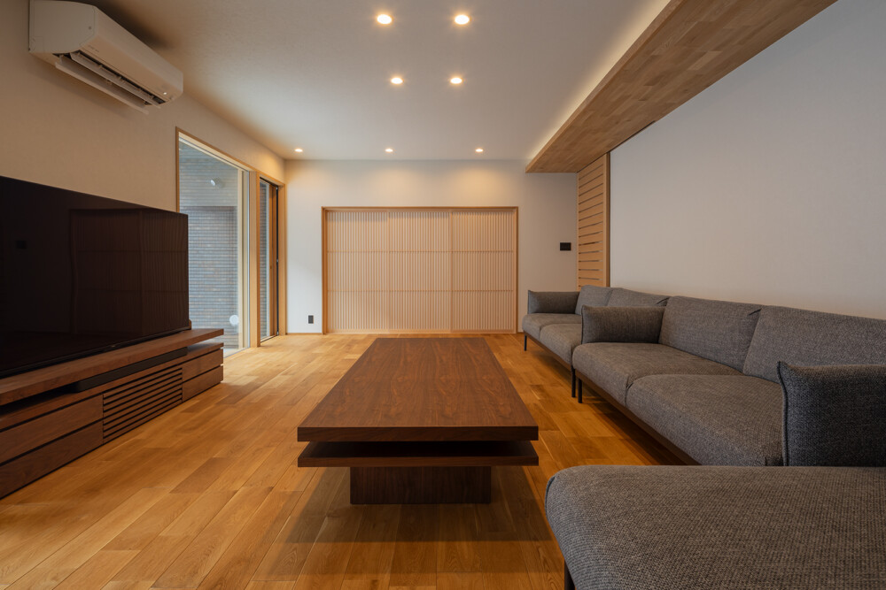造作建具、造作家具がご要望でした。 キッチンと洗面も既製品ではなく製作させていただきました。床のフローリングはオーク材を使い、和室の座卓もブビンガの一枚板で作りました。 LDKからの掃き出しのサッシも既製品を使いたくないとのご要望で木製建具で作りました。